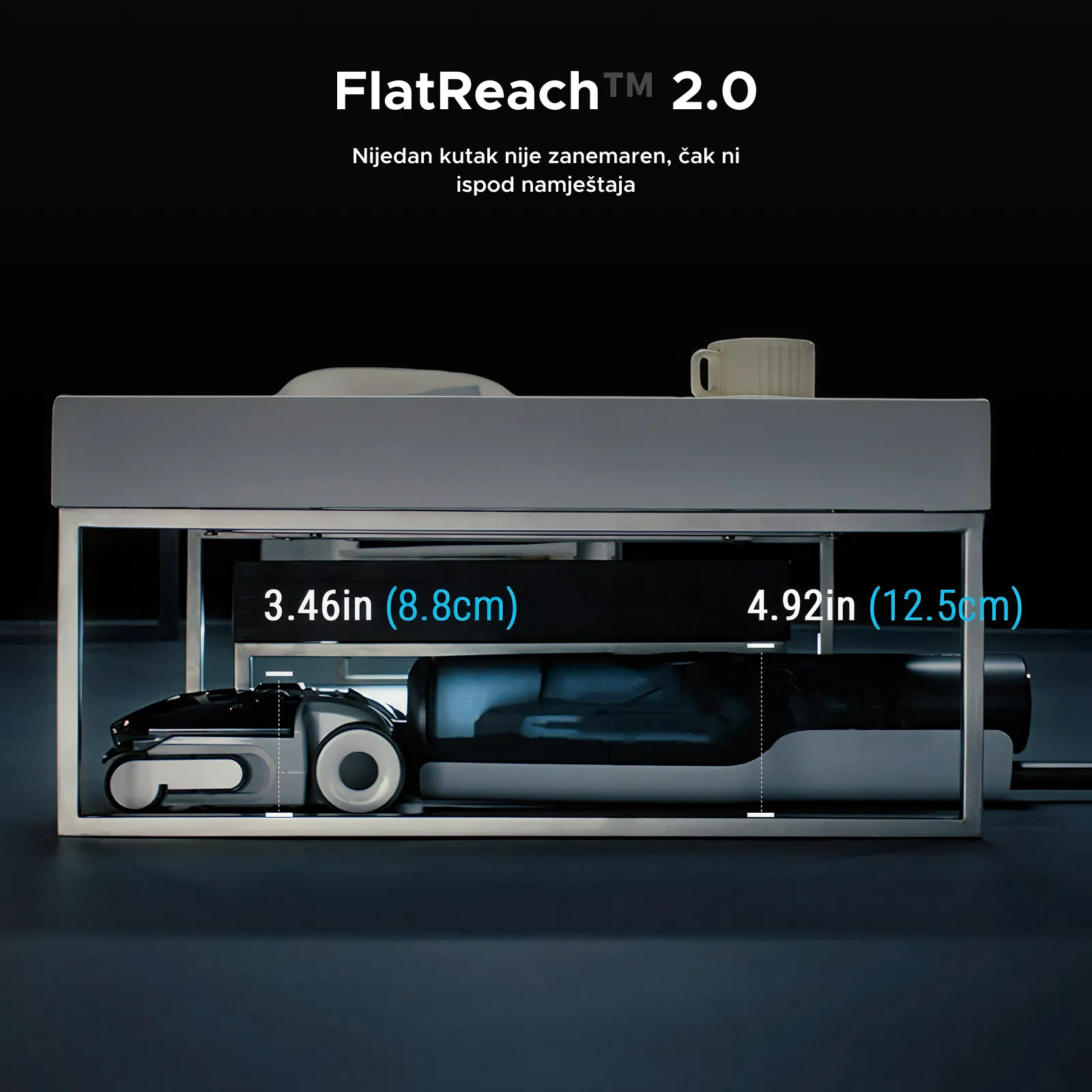 Snažno usisavanje i u uskim prostorima zahvaljujući tankom dizajnu od 12,5 cm, koji zadržava punu usisnu snagu pri 0°. Njegov ultra-nizak profil dopire do svakog ugla i ne ostavlja prašinu iza sebe.*