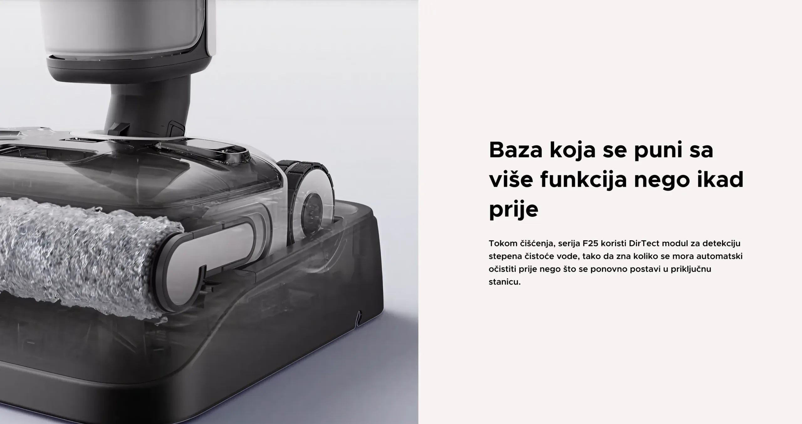 Postignite vrhunsku čistoću s inteligentnim automatskim pranjem i sušenjem vrućom vodom. Hermetički zatvorena baza optimizira sušenje, dok pametna tehnologija prilagođava potrebe za samostalnim čišćenjem vašeg F25. Napredna tehnologija odvajanja čvrstih čestica, tekućina i zraka osigurava temeljito čišćenje pri svakom pokretanju.