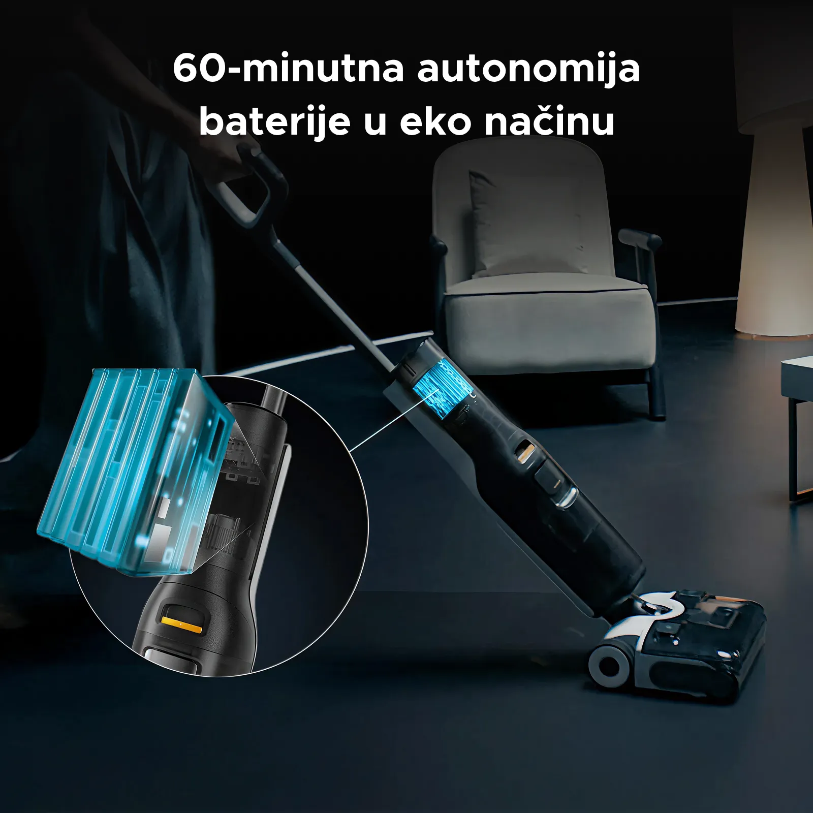 Sa do 60 minuta rada u eko režimu omogućava neprekidne cikluse čišćenja i pokriva do 410 m² sa jednim punjenjem.
