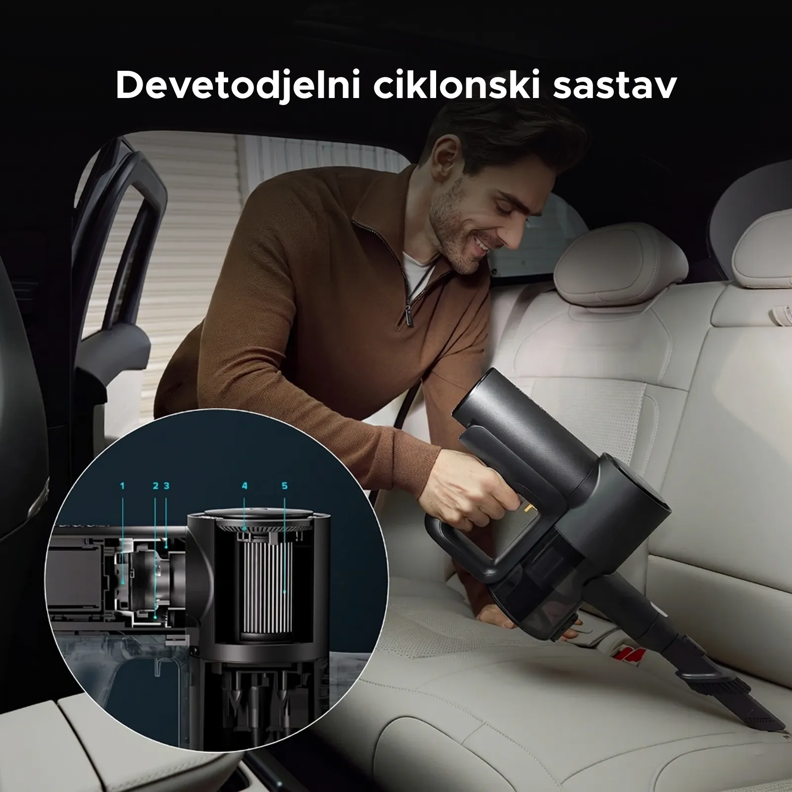 Snažne ciklonske sile u kombinaciji sa mikronski preciznim petoslojnim filtracionim sistemom razdvajaju čestice prašine koje su do 8 puta manje od PM2.5, čime se sprječava začepljenje filtera i nakupljanje prašine.
