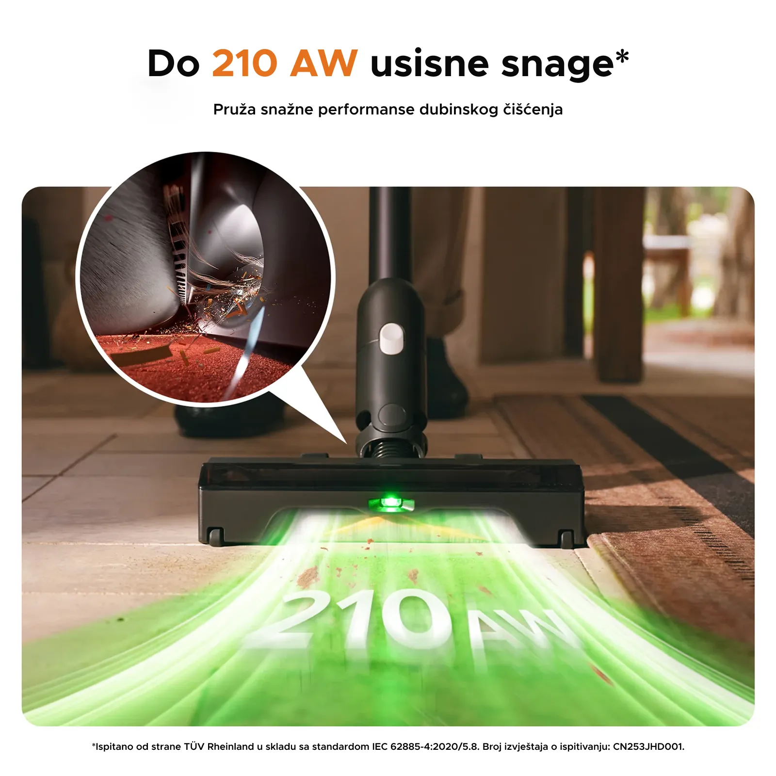 Roborock H60 Ultra nudi snažnu usisnu moć od 210 AW i brzo uklanja prljavštinu, prašinu i ostatke sa tepiha i tvrdih podova. Performanse certificirane od strane TÜV Rheinland osiguravaju temeljno čišćenje pri svakoj upotrebi.